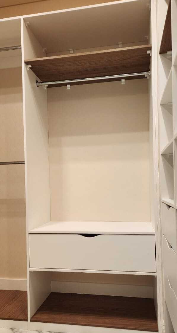 Внутри сделаны полки из утолщенного ЛДСП 25мм, выдвижные ящики и штанги для верхней одежды;