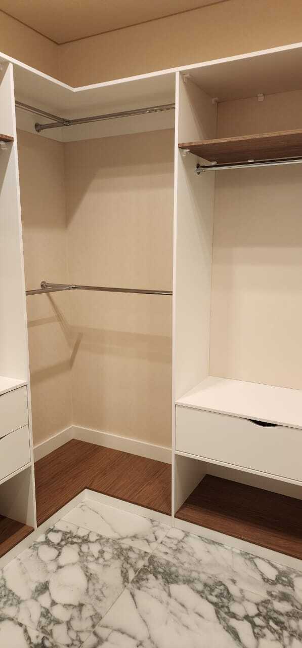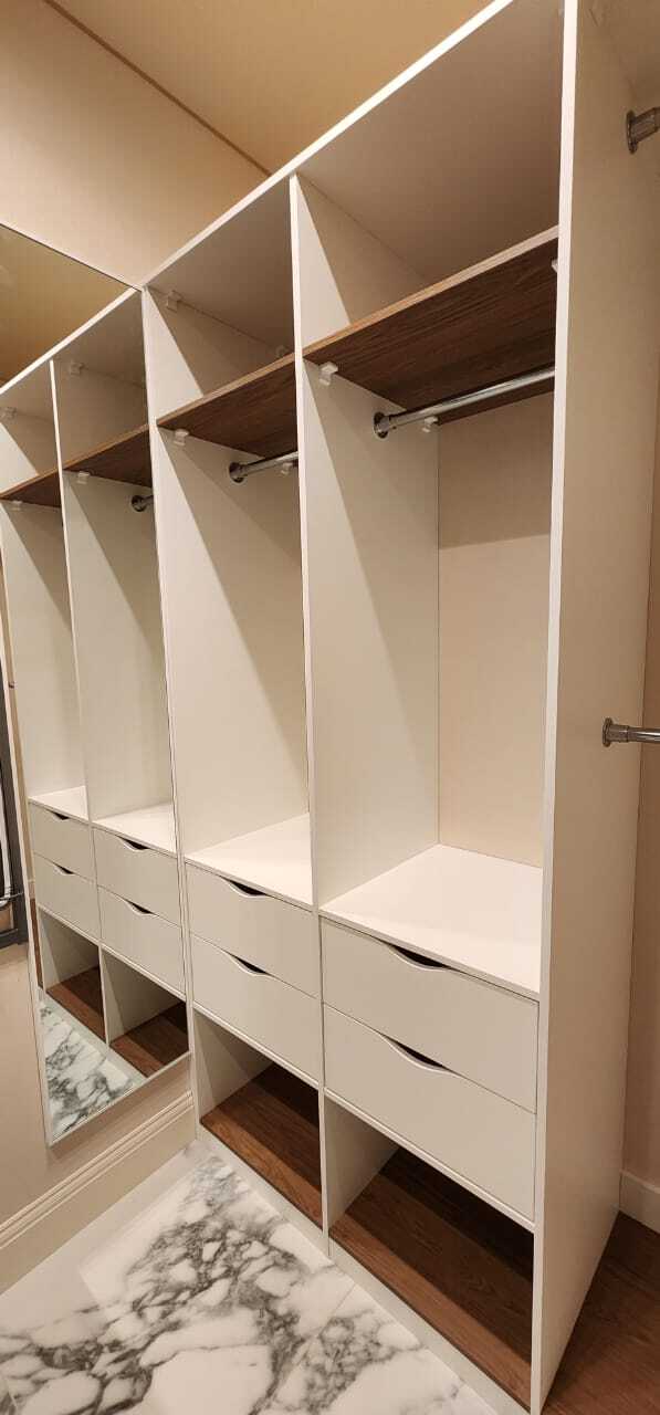Гардеробная комната сделана из ЛДСП белого цвета;