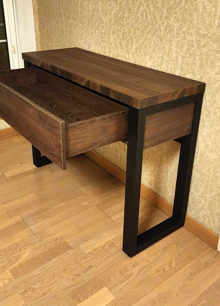 Стол на железной ноге с выдвижным ящиком и полкой на стене (ЛДСП Дуб Термо черно-коричневый H1199)