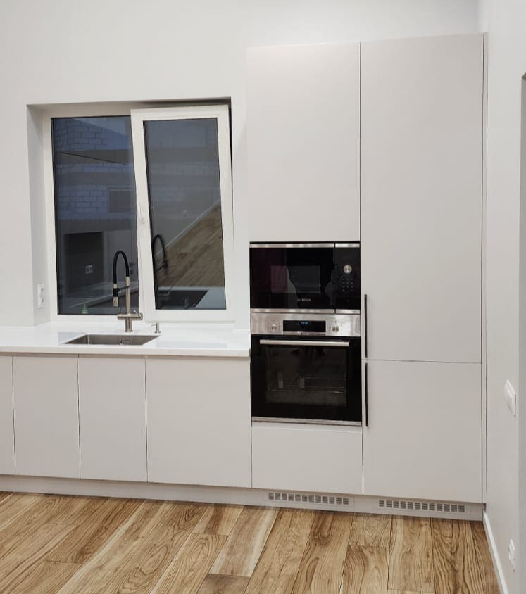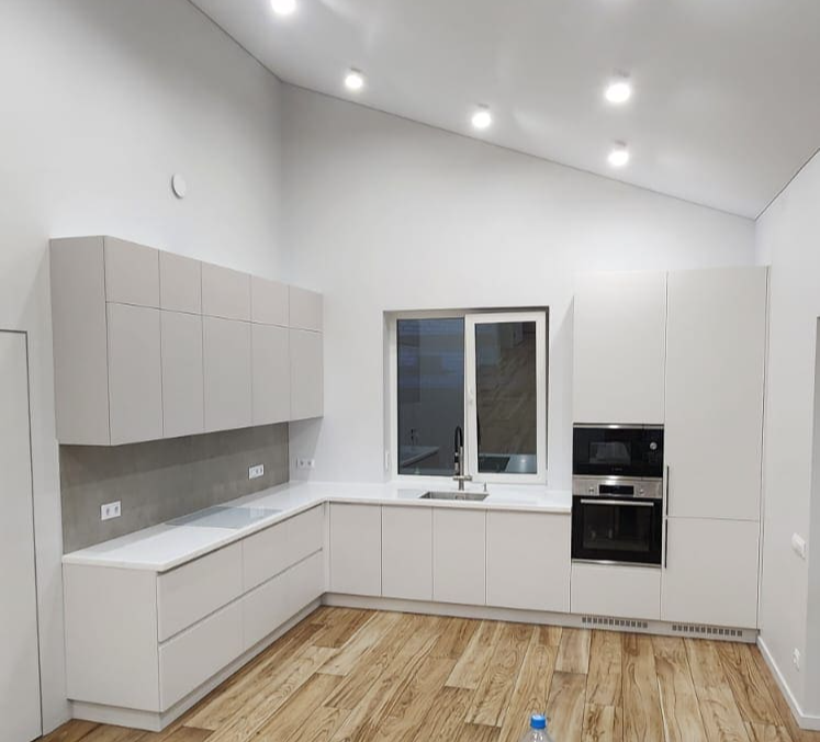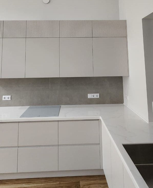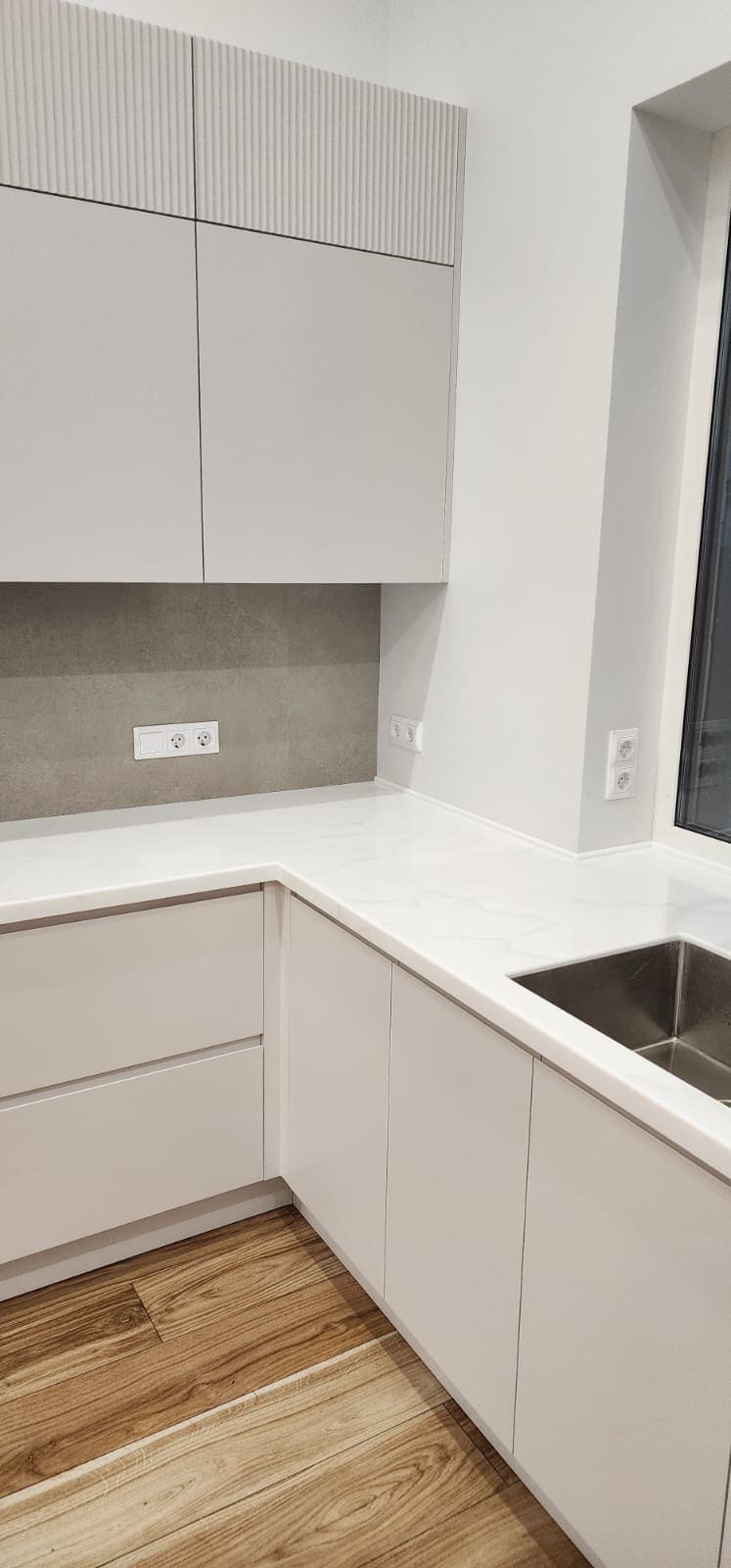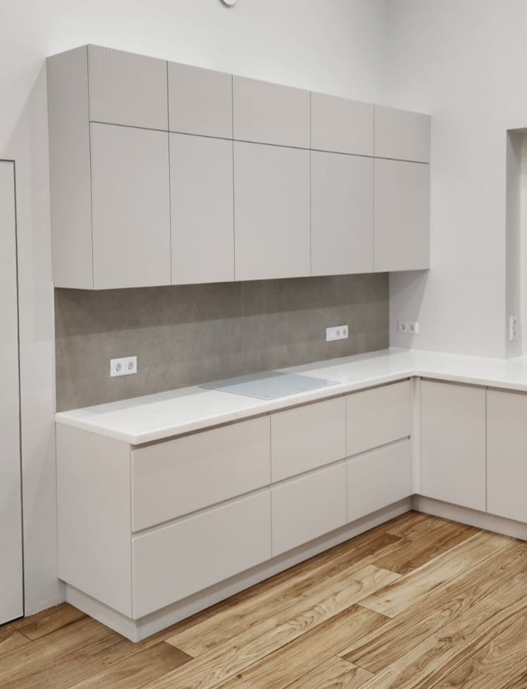 Кухня угловая, фасады эмаль матовая NCS S 2000N, низ фасады с интегрированной ручкой, столешница искусственный камень supreme vc110 cotton white