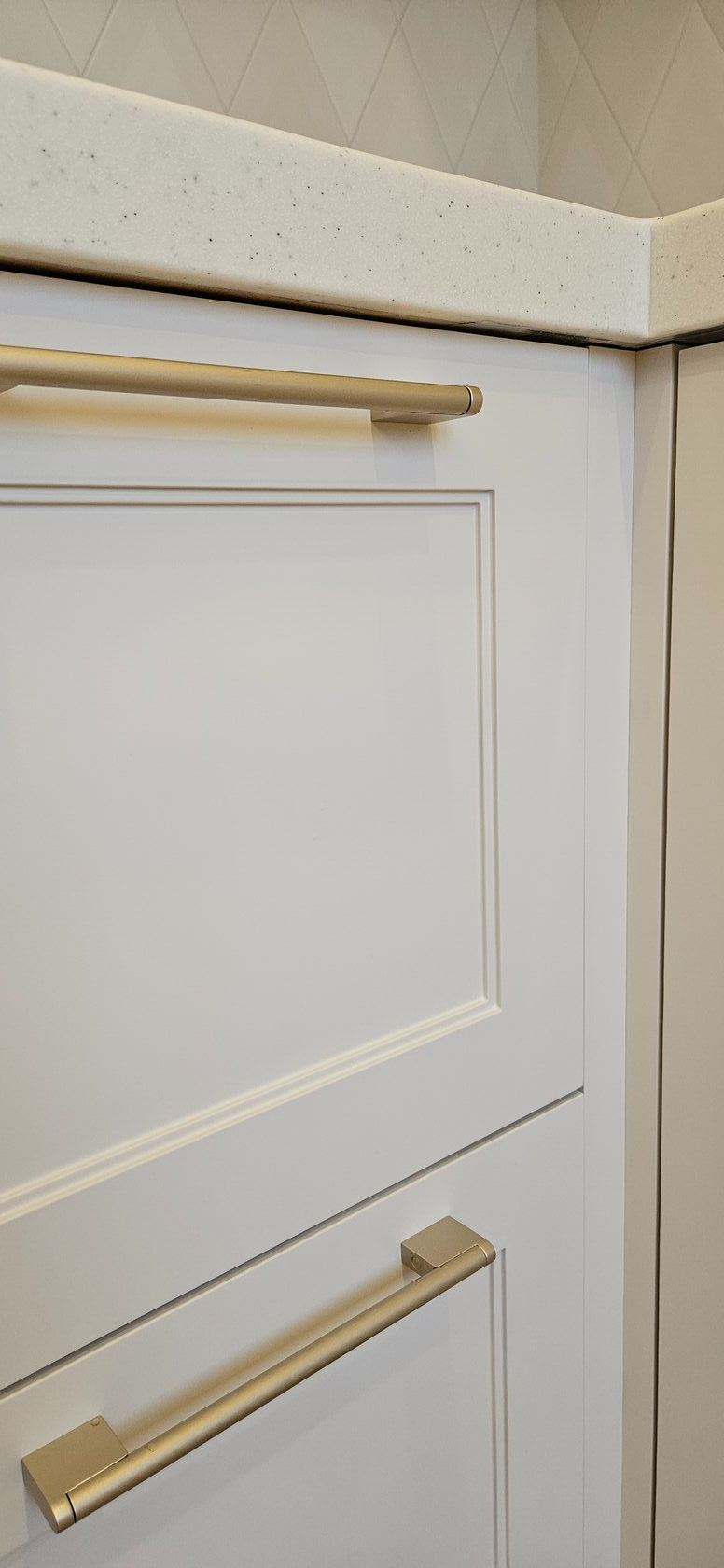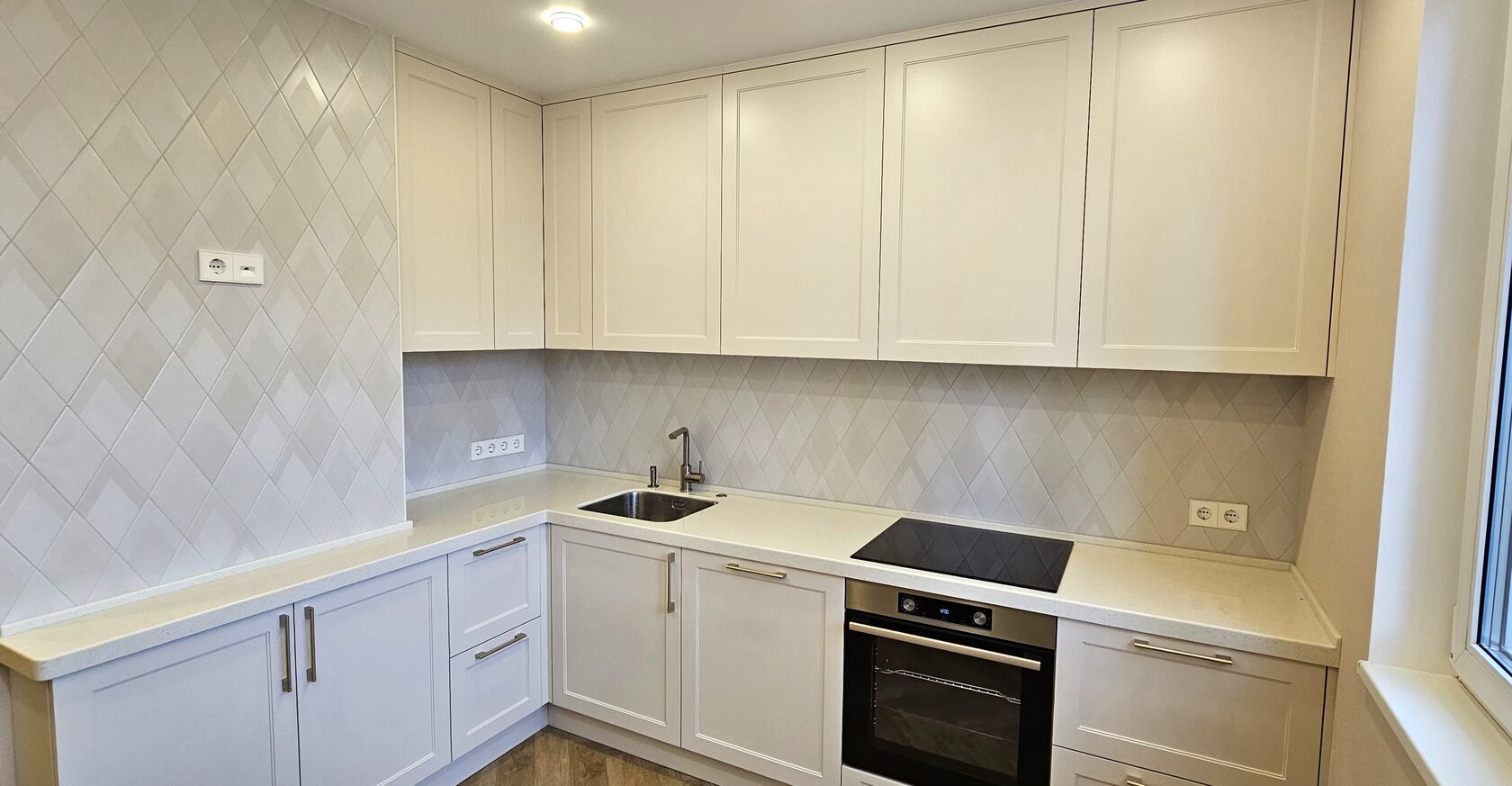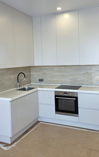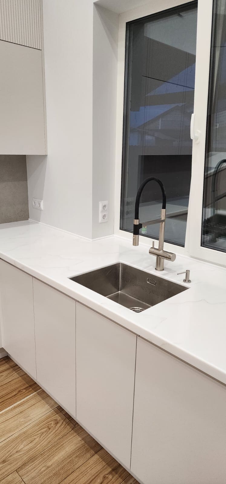 Кухня угловая, фасады эмаль матовая NCS S 2000N, низ фасады с интегрированной ручкой, столешница искусственный камень supreme vc110 cotton white
