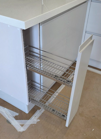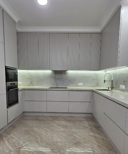 Кухня П-образная, Столешница из искусственного камня supreme VN144 natural bridge, фасады эмаль матовая NCS S 1502- Y50R с интегрированной ручкой на нижних фасадах, на верхних фасадах фрезеровка Волна