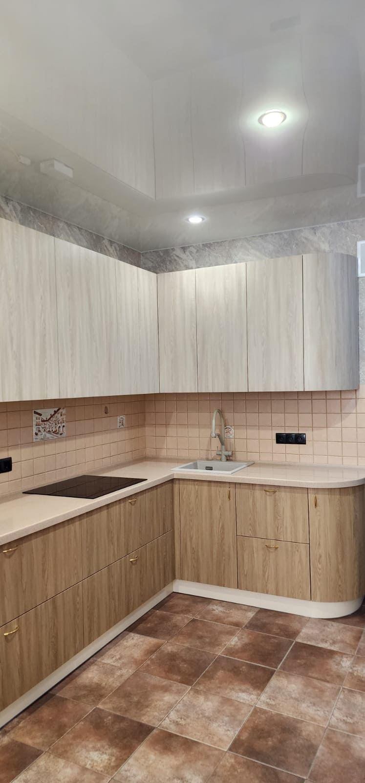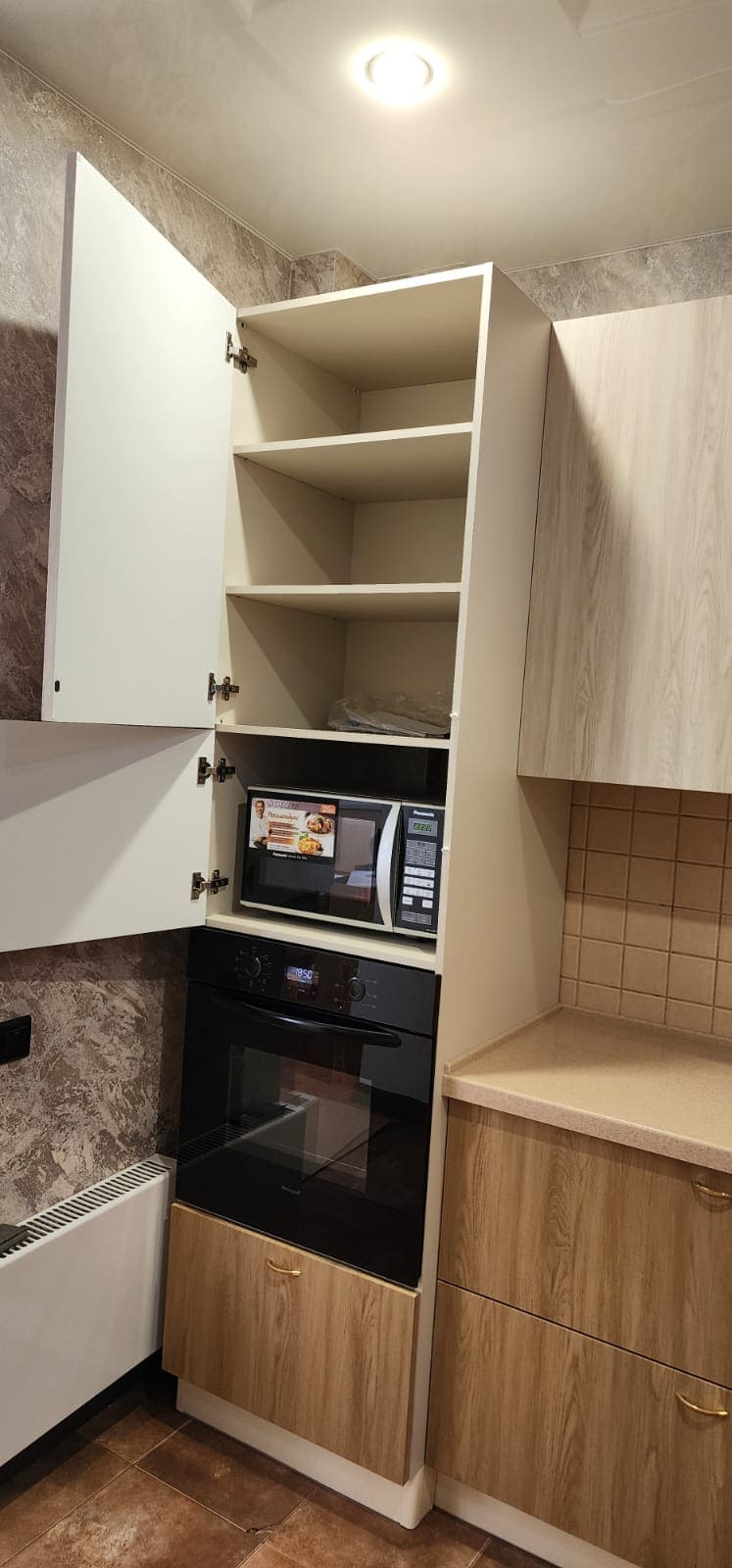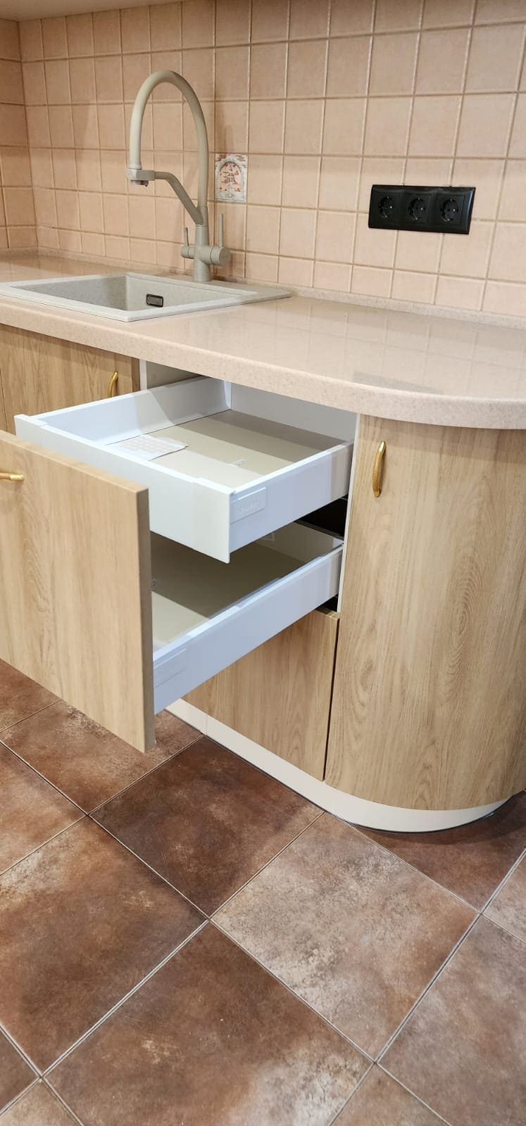 Фасады пленка молочного цвета и текстурное ЛДСП цвета натурального дерева;