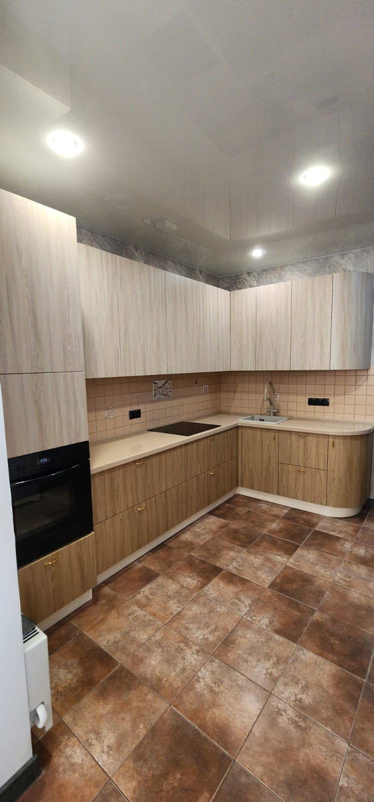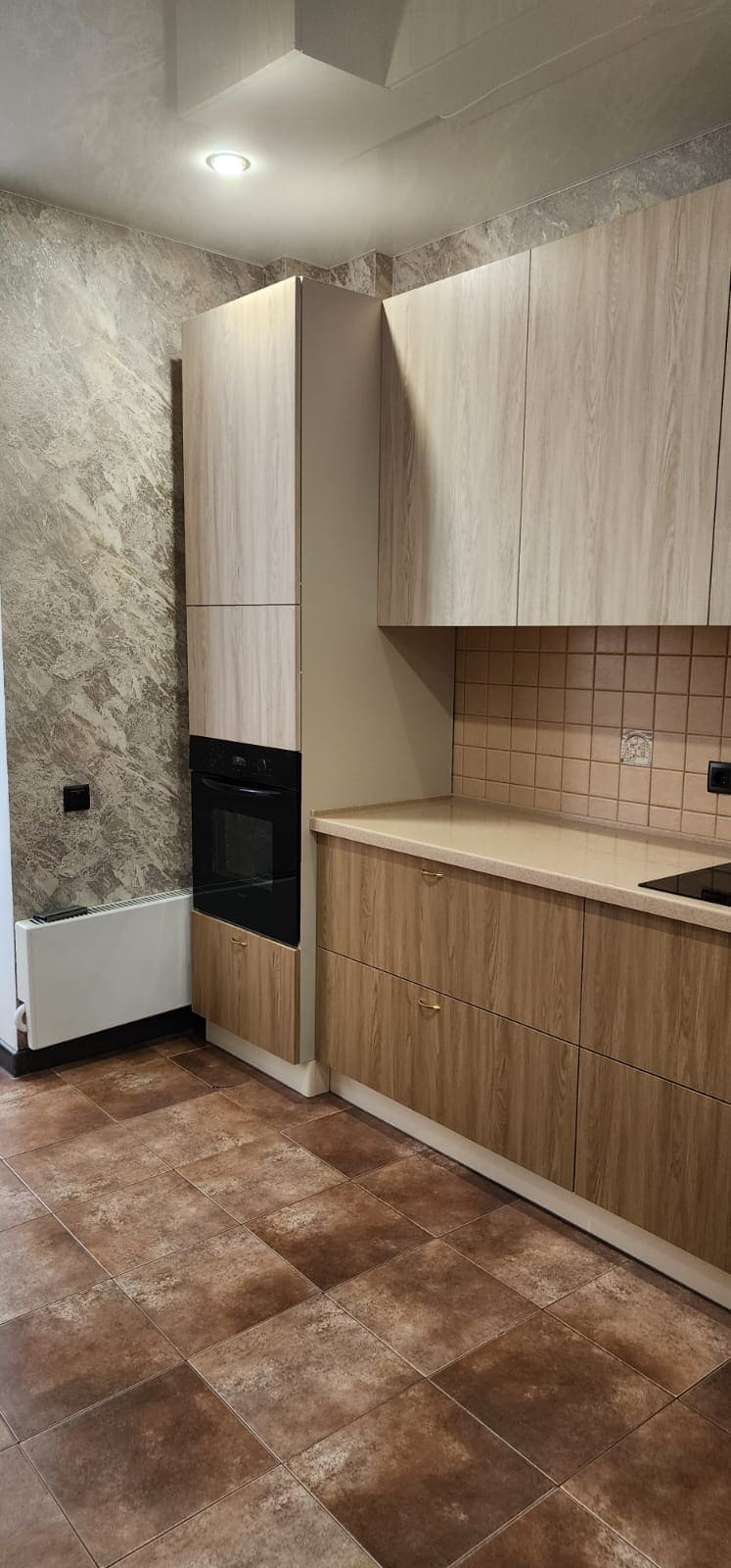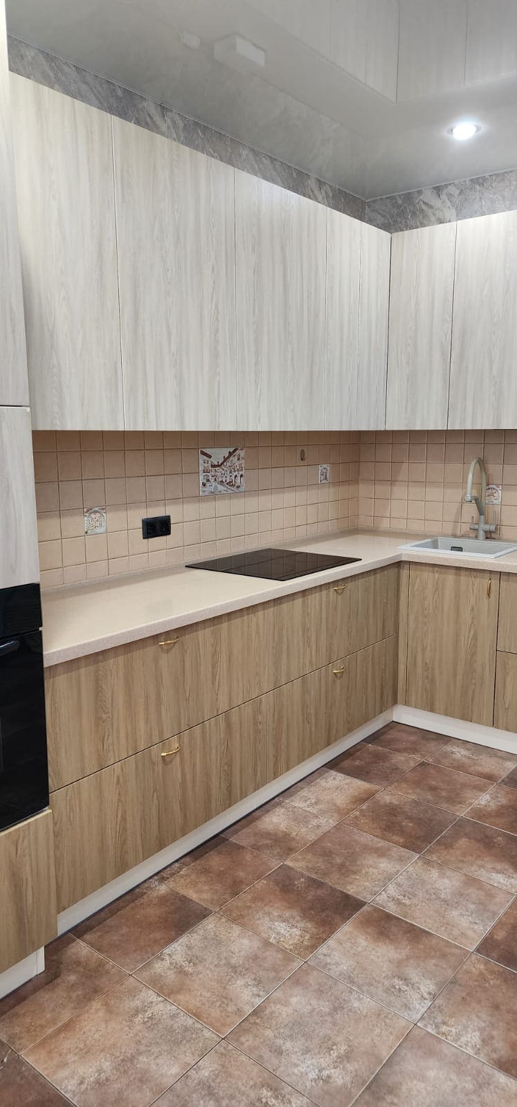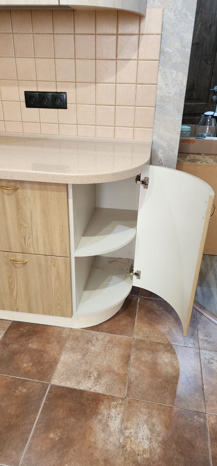 Фасады пленка молочного цвета и текстурное ЛДСП цвета натурального дерева;