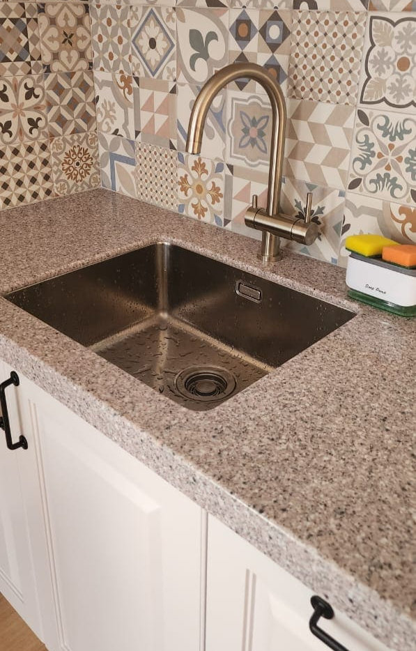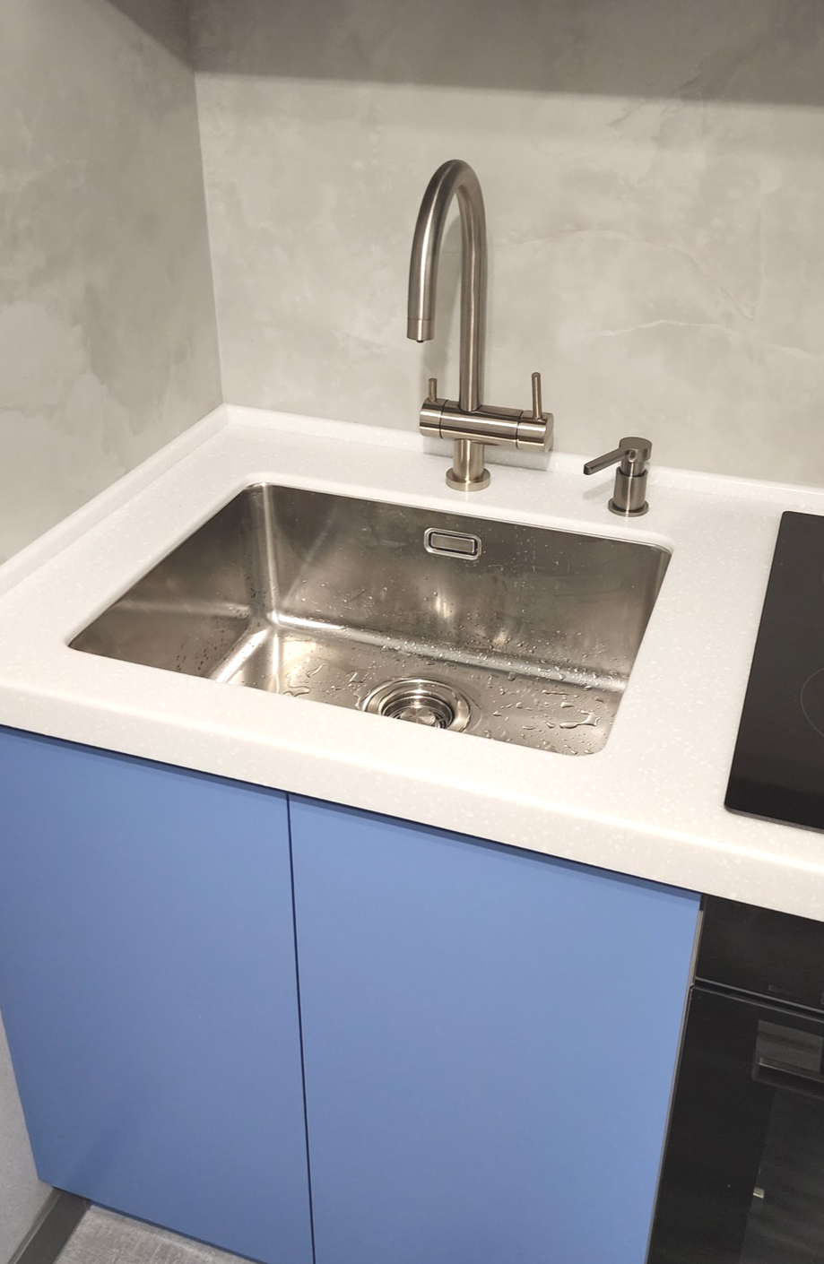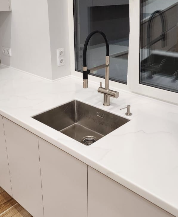 Столешница сделана из искусственного камня с интегрированной мойкой;