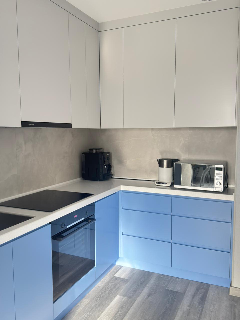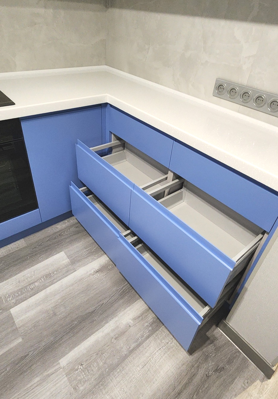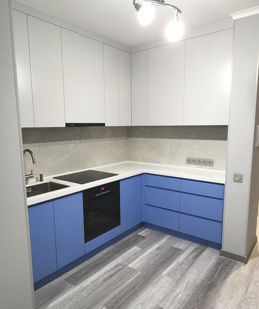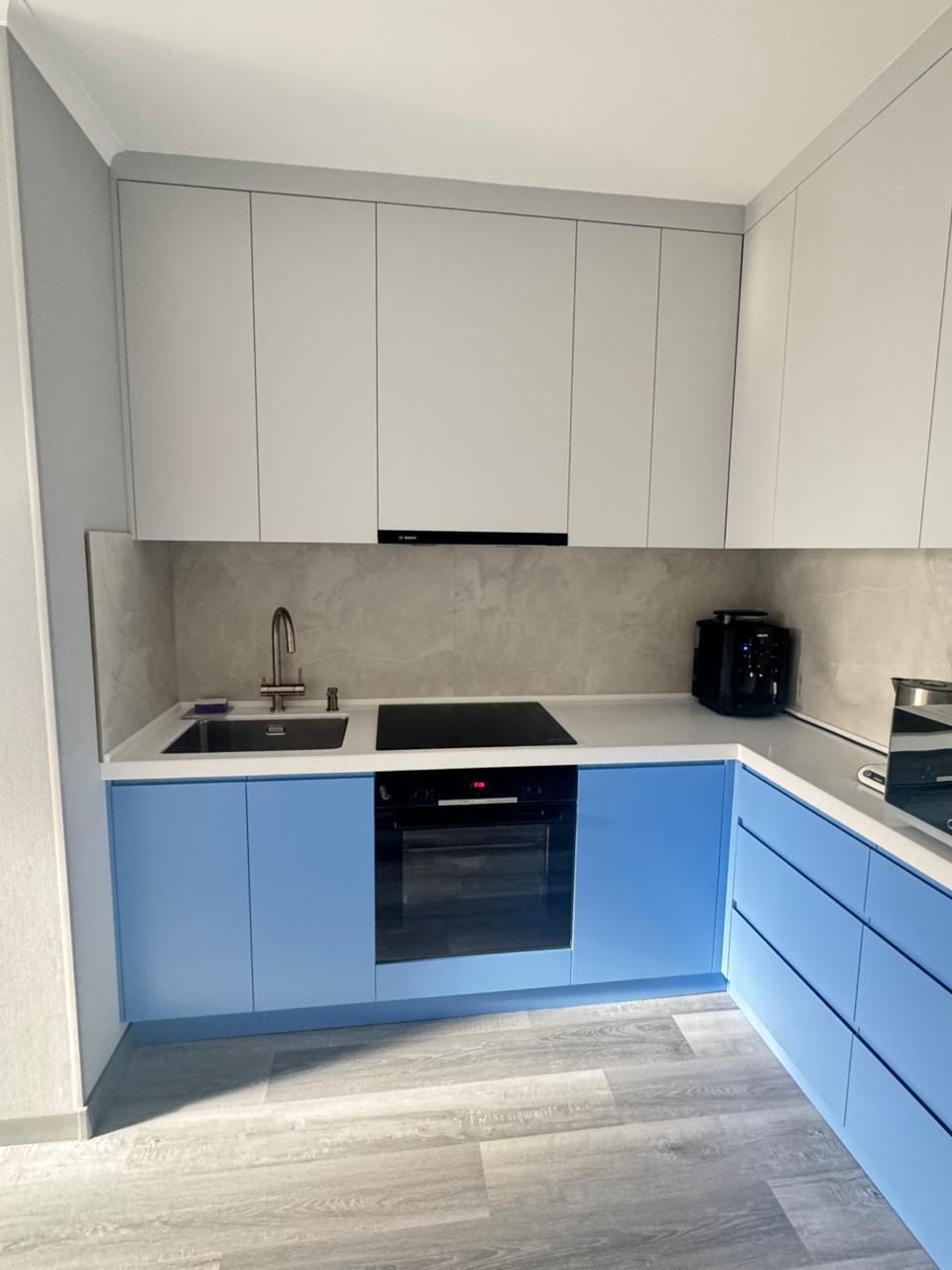 Фасады эмаль матовая верх NCS S 1502B, низ NCS S 2040 R80B с интегрированной ручкой;