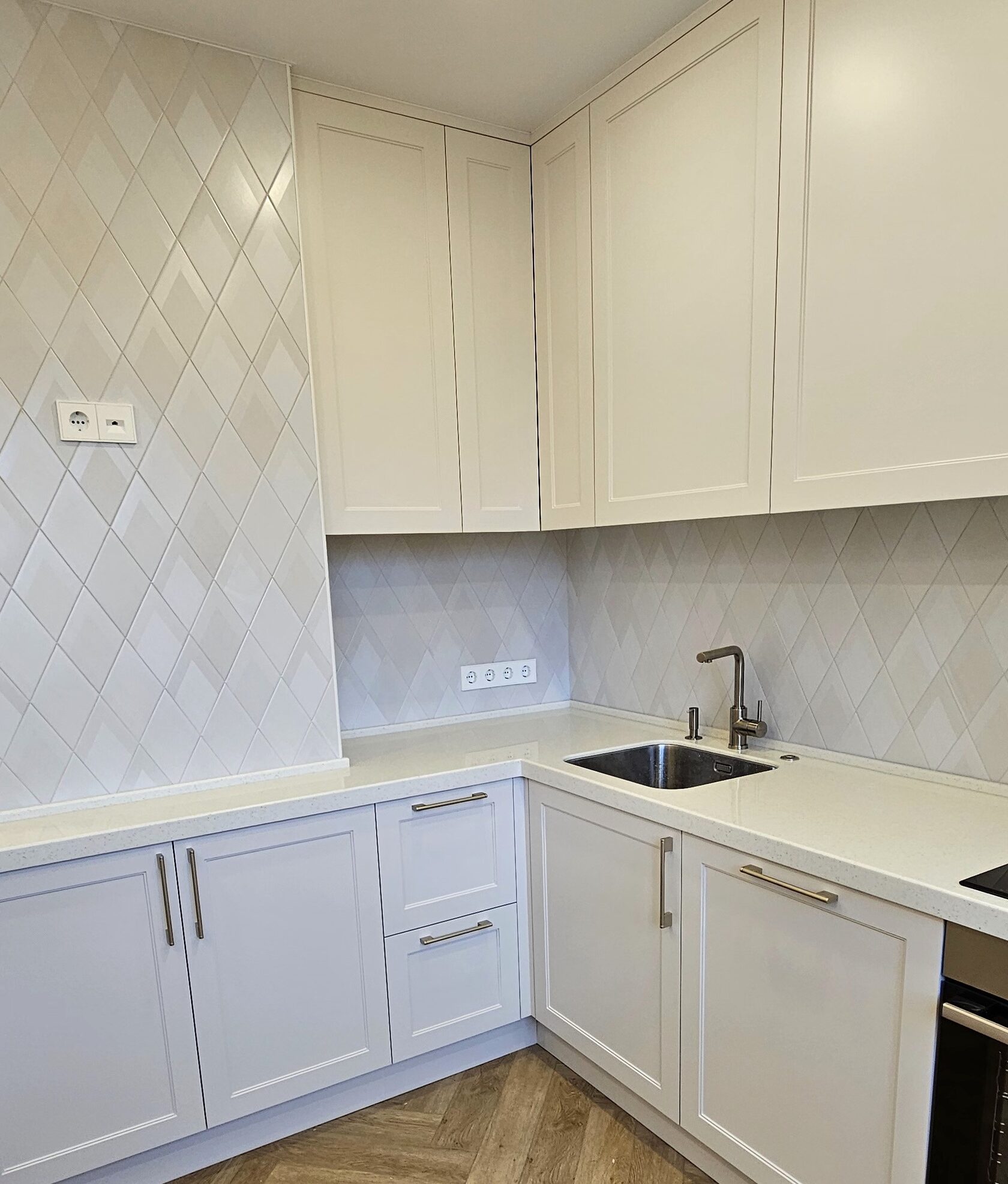 Кухня угловая, с столешницей из искусственного камня Supreme VC110 Cotton White, фасады эмаль матовая верх NCS S 1502-R, низ и колонка NCS S 1000-N