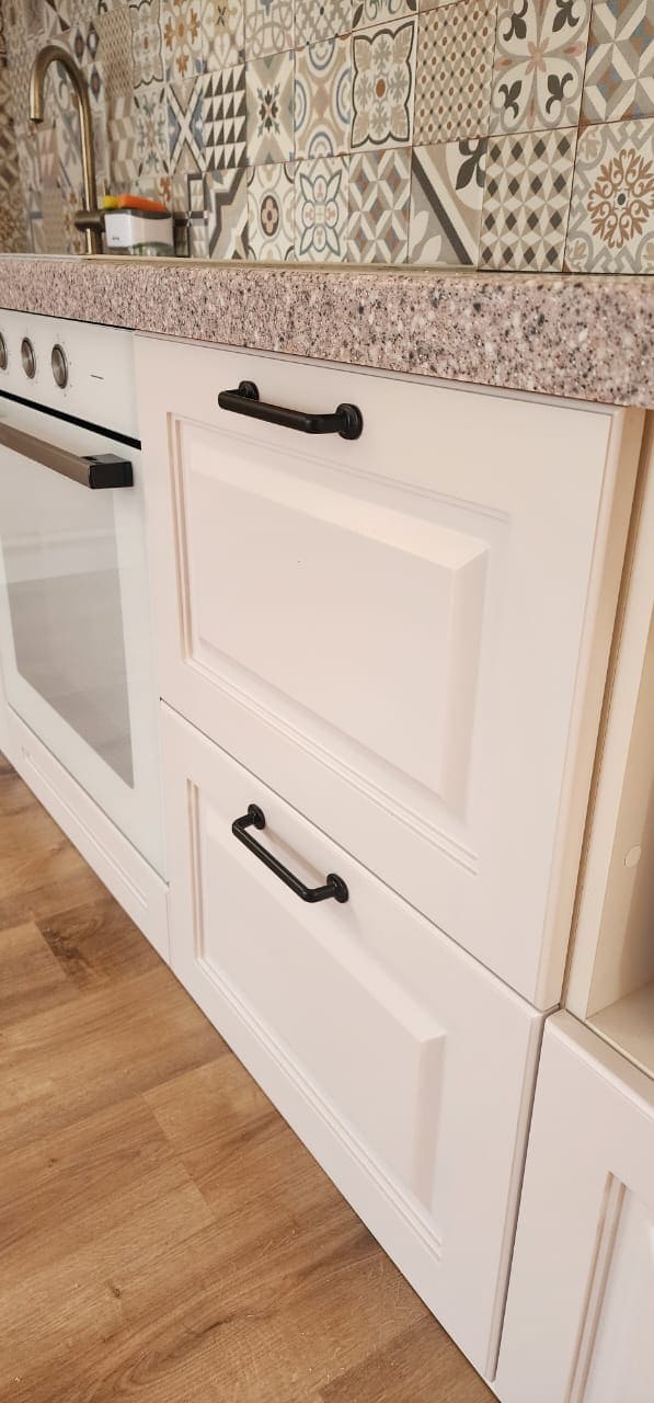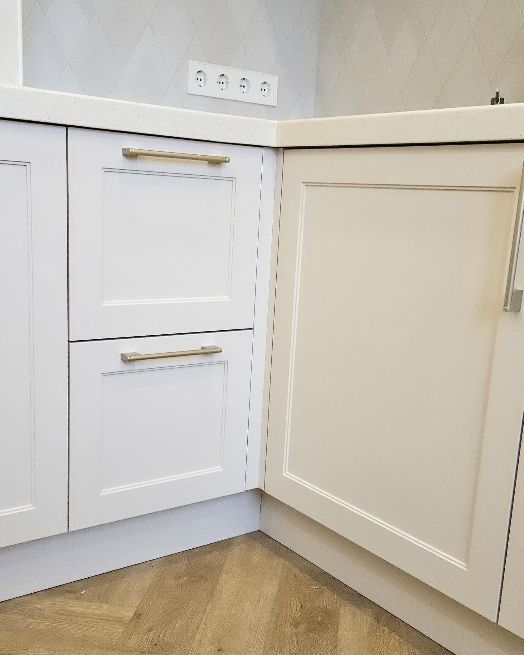 Фасады крашенные двух цветов, верхние фасады удлиненные без ручек;