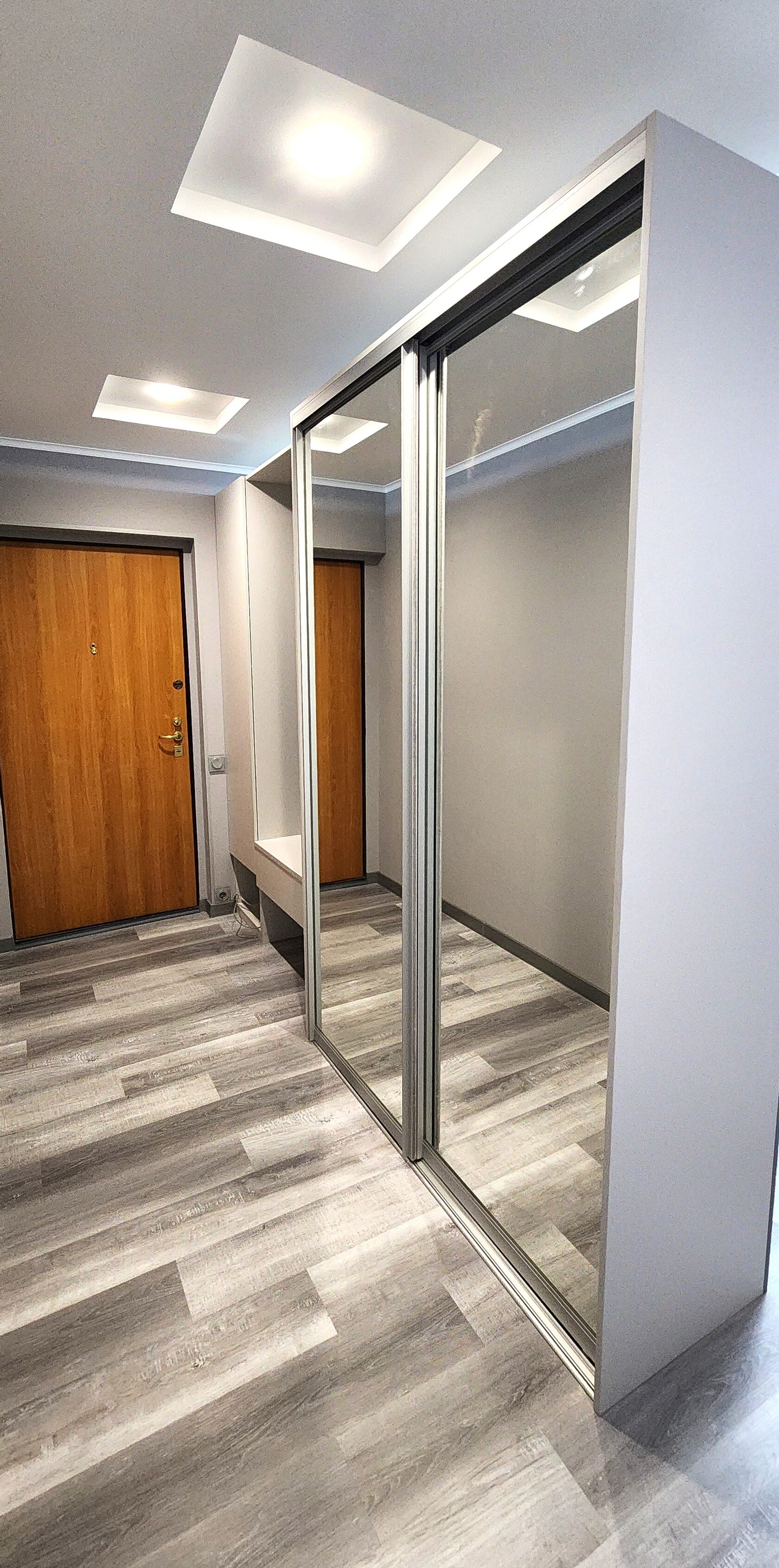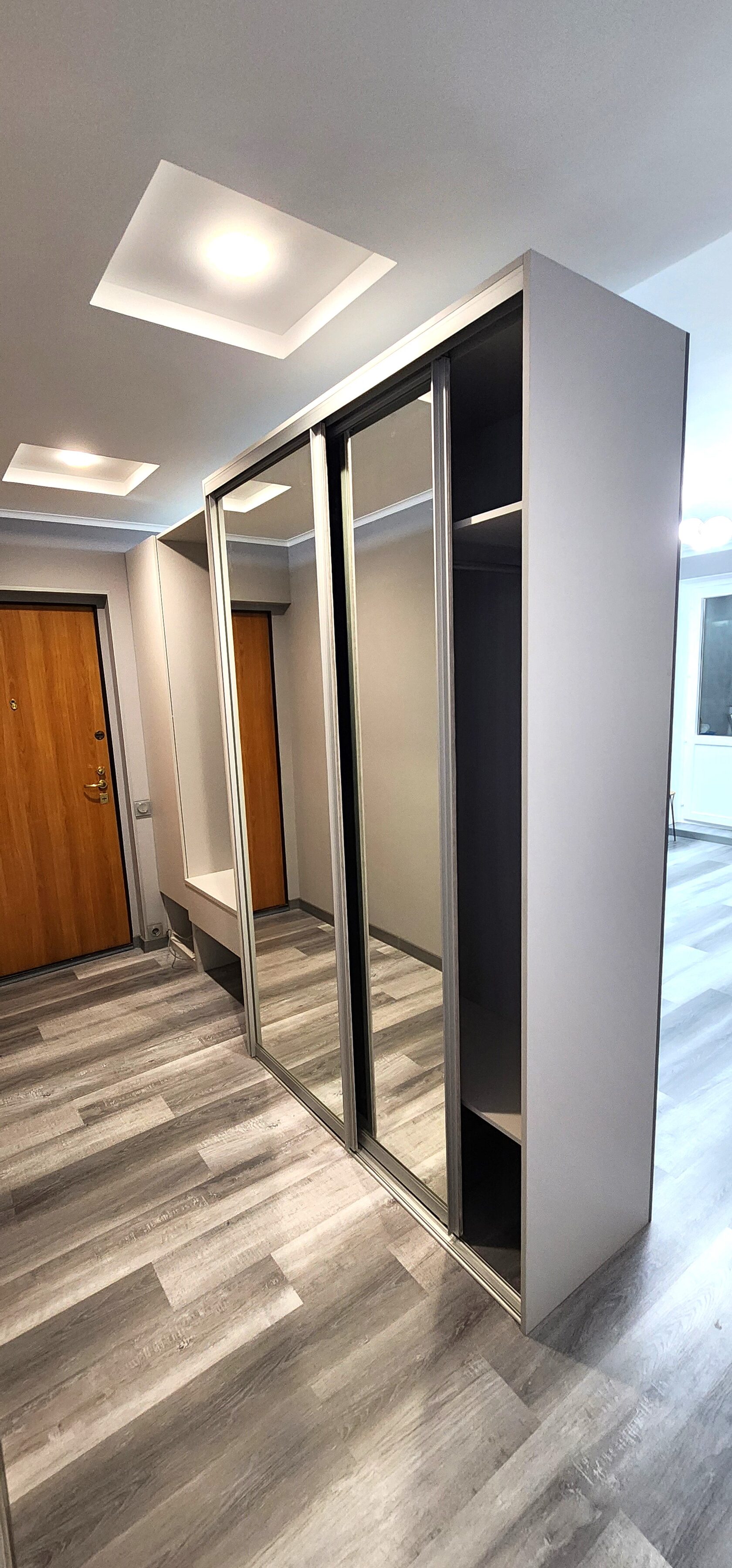 Шкаф-купе зеркальный, открытая панель для верхней одежды с крючками
