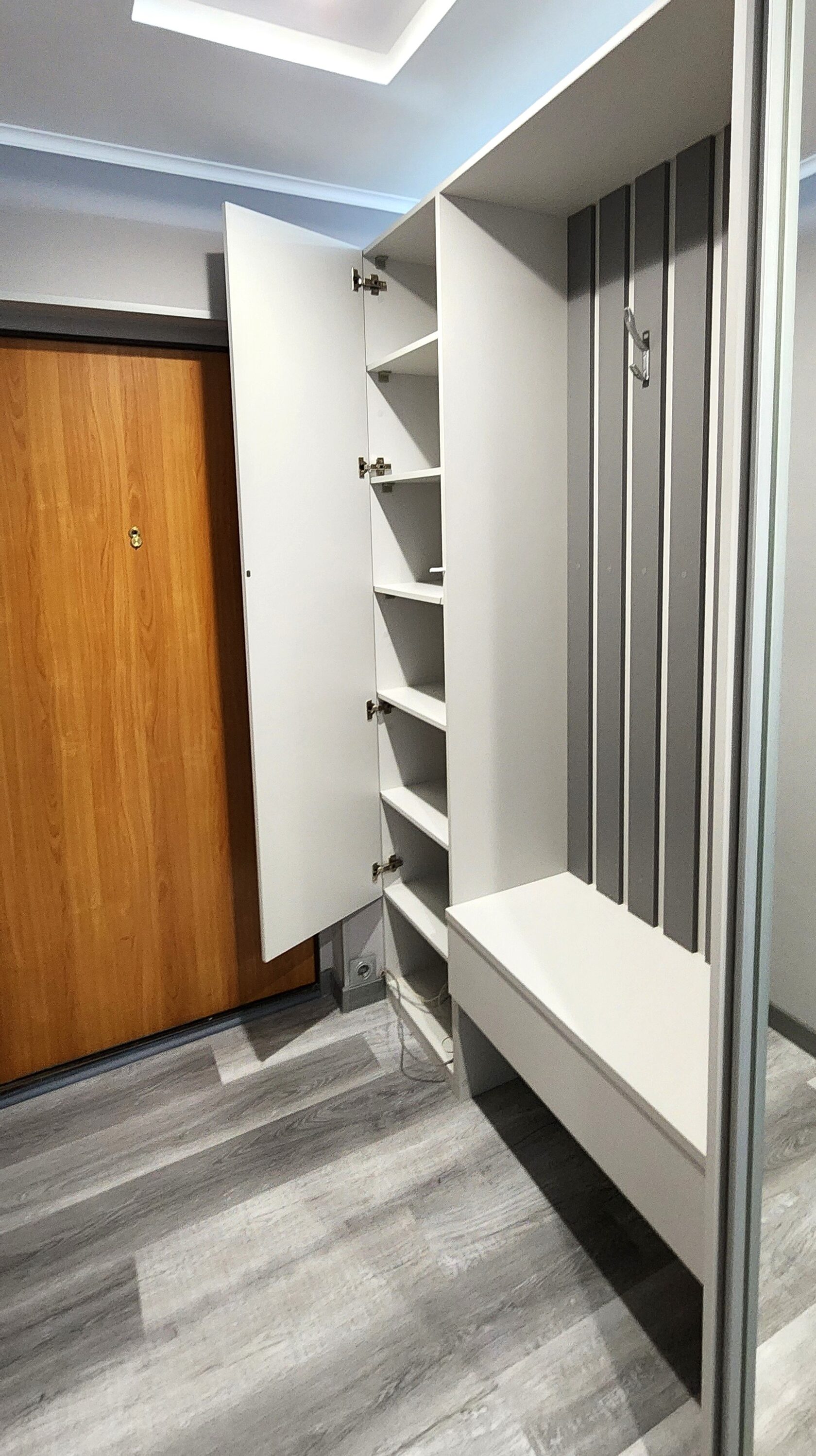Шкафы с распашными дверями крашенные и открытая вешалка из планок и тумбой текстурного ЛДСП