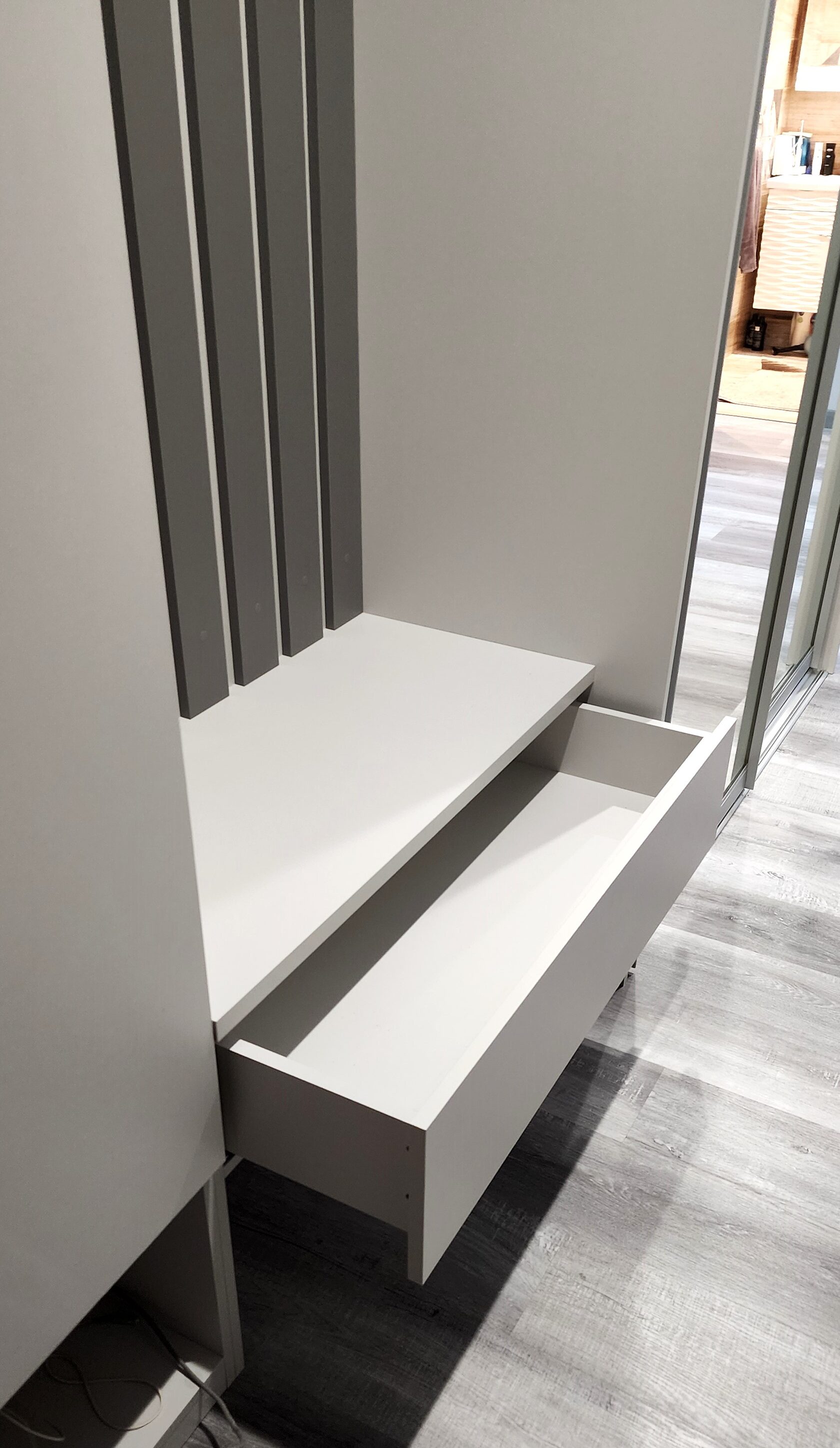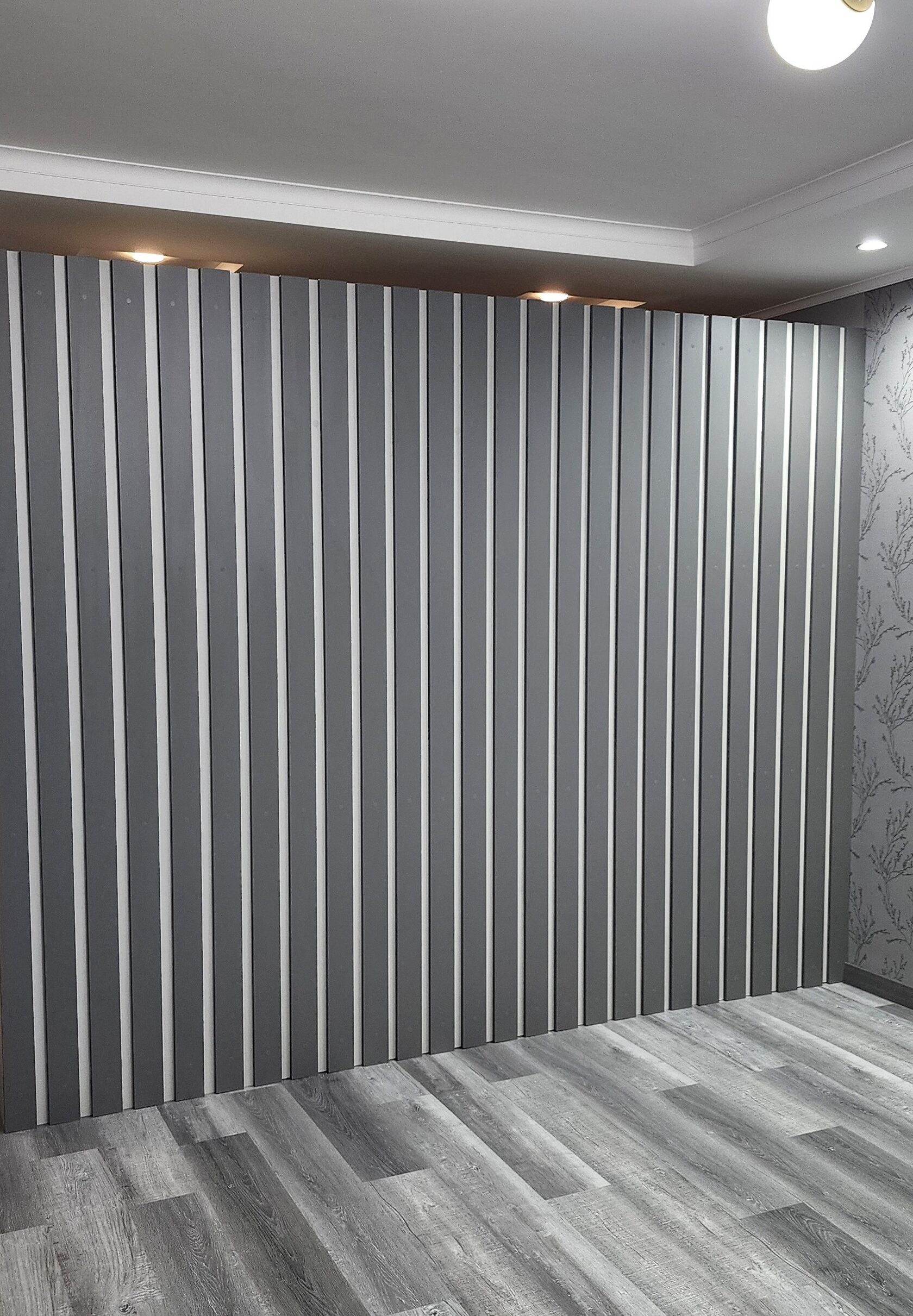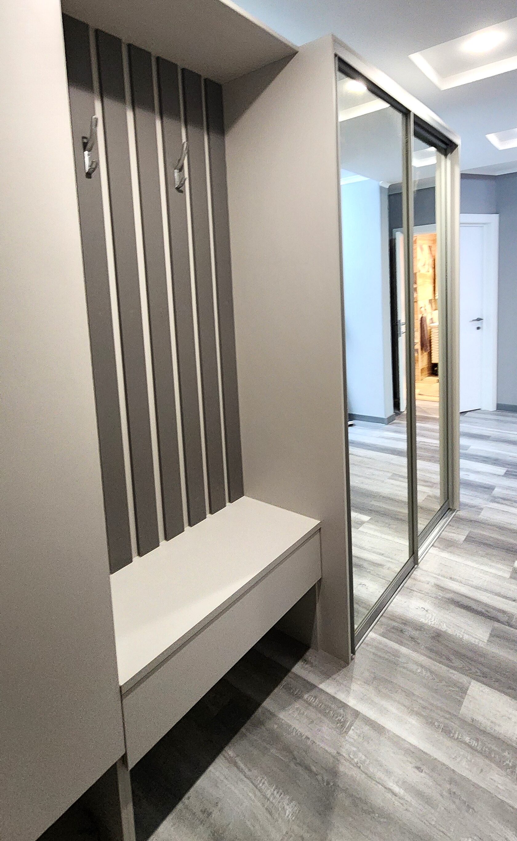 Шкаф-купе с зеркальными дверьми, подвесная тумба, колонка и стена из реек. Цвет мебели "Светло серый и Серый асфальт"