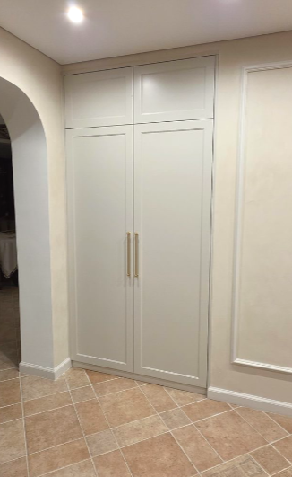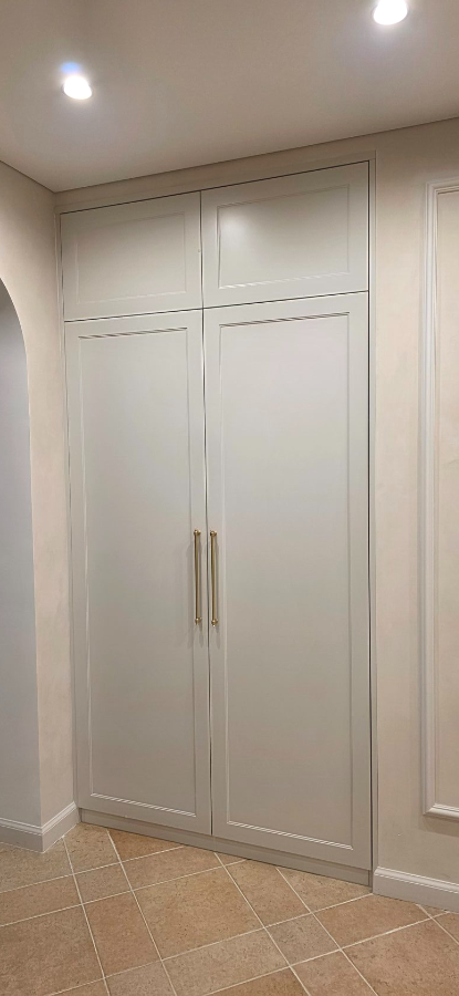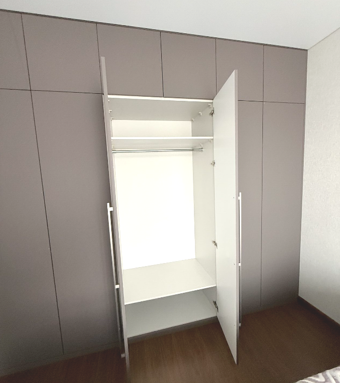 Шкаф распашной 2-х дверный в зоне балкона, фасады эмаль матовая NCS S 0505 Y20R с интегрированной ручкой