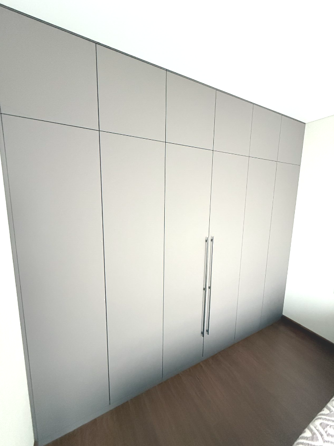 Шкаф распашной 4х дверный с антресолью, фасады эмаль матовая NCS S 1000N, c с интегрированной ручкой, вверху фасады на TIP-ON