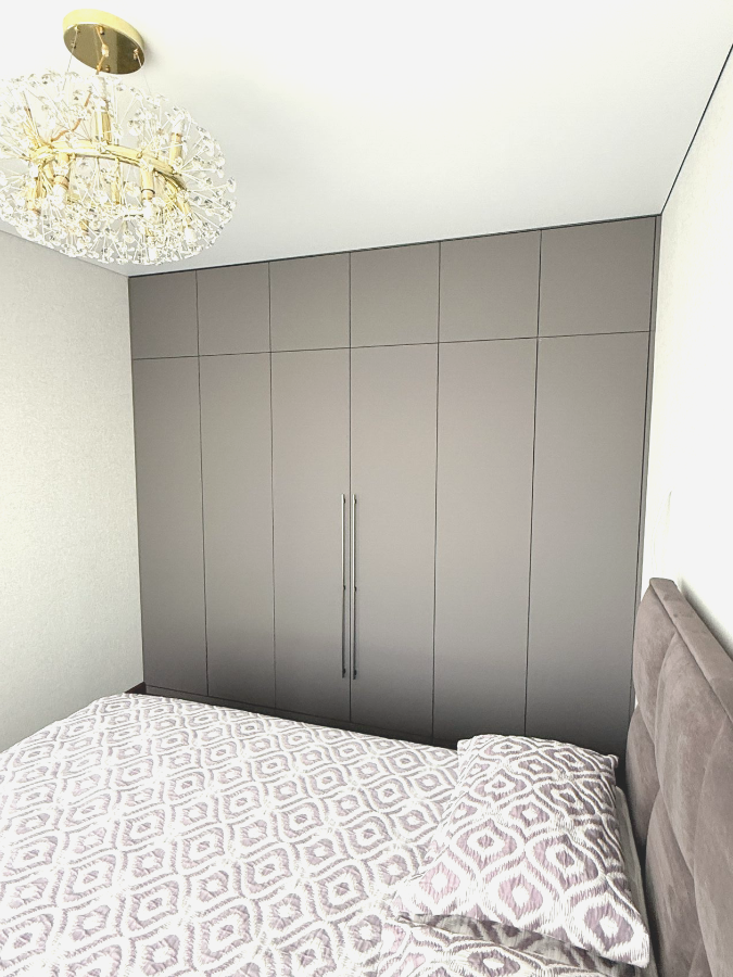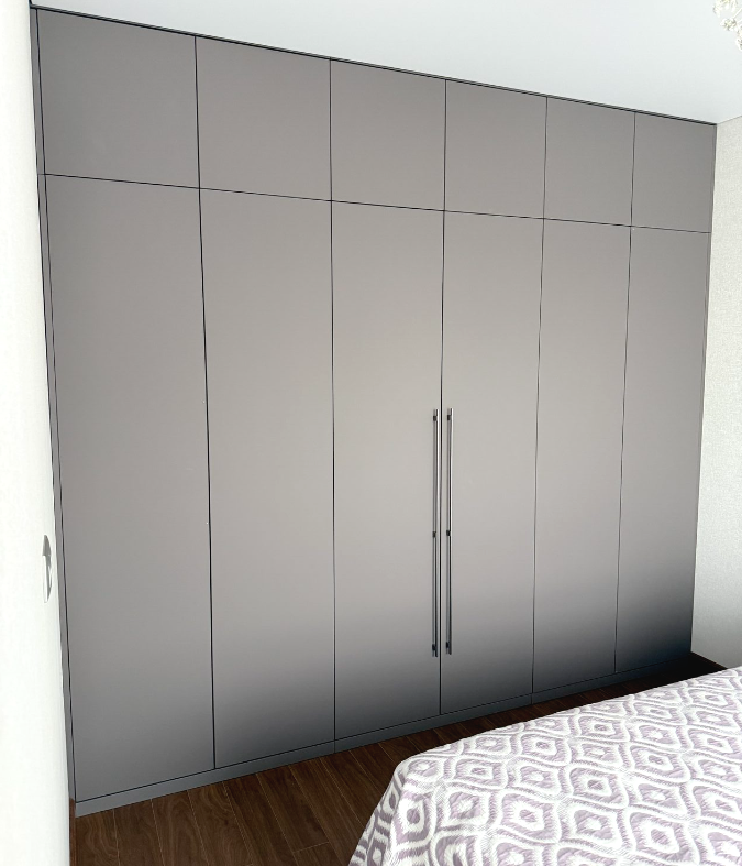 Шкаф в спальне 8ми дверный, Двери покрашены эмаль матовая NCS S 2002-Y50R с интегрированной ручкой