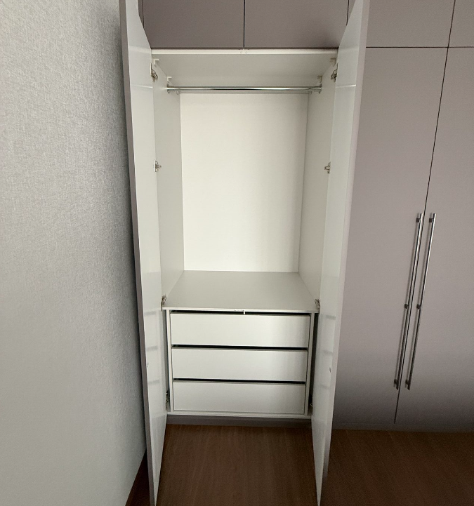 Внутри шкафа полочки, выдвижные ящики и штанга для верхней одежды.
