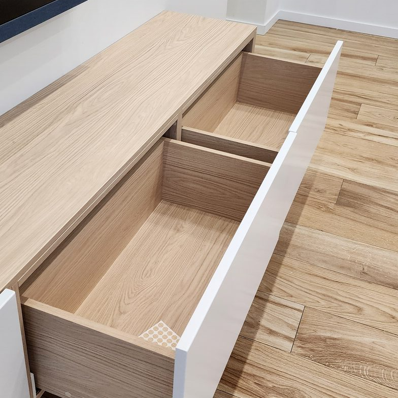 Тумба под ТВ в гостиной с выдвижными ящиками
