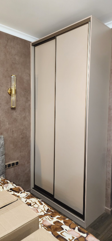 Двери-купе крашенное матовое стекло, текстурное ЛДСП и черного цвета рамка;