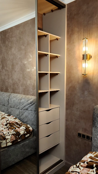 Внутри шкафа полочки, выдвижные ящики и штанга для верхней одежды.